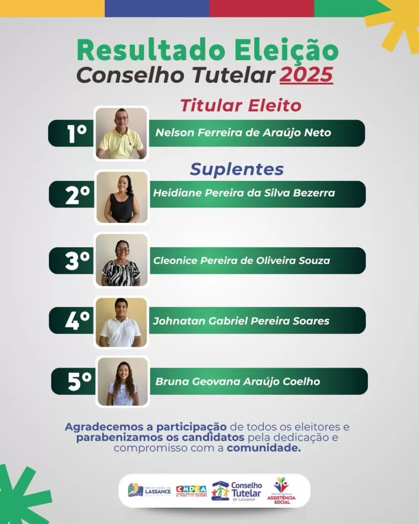 Com 230 votos, Nelson Ferreira de Araújo Neto foi o candidato mais votado, conquistando a vaga de titular eleito para o Conselho Tutelar 2025.