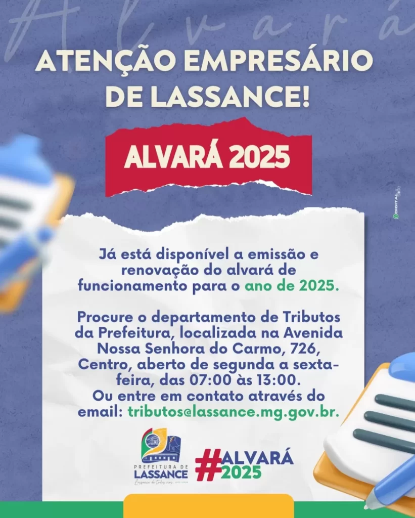 A Prefeitura de Lassance reforça a importância da regularização do alvará de funcionamento para o ano de 2025. Empresários e comerciantes devem procurar o setor de tributos para obter mais informações sobre a renovação e garantir a conformidade legal de seus estabelecimentos.
