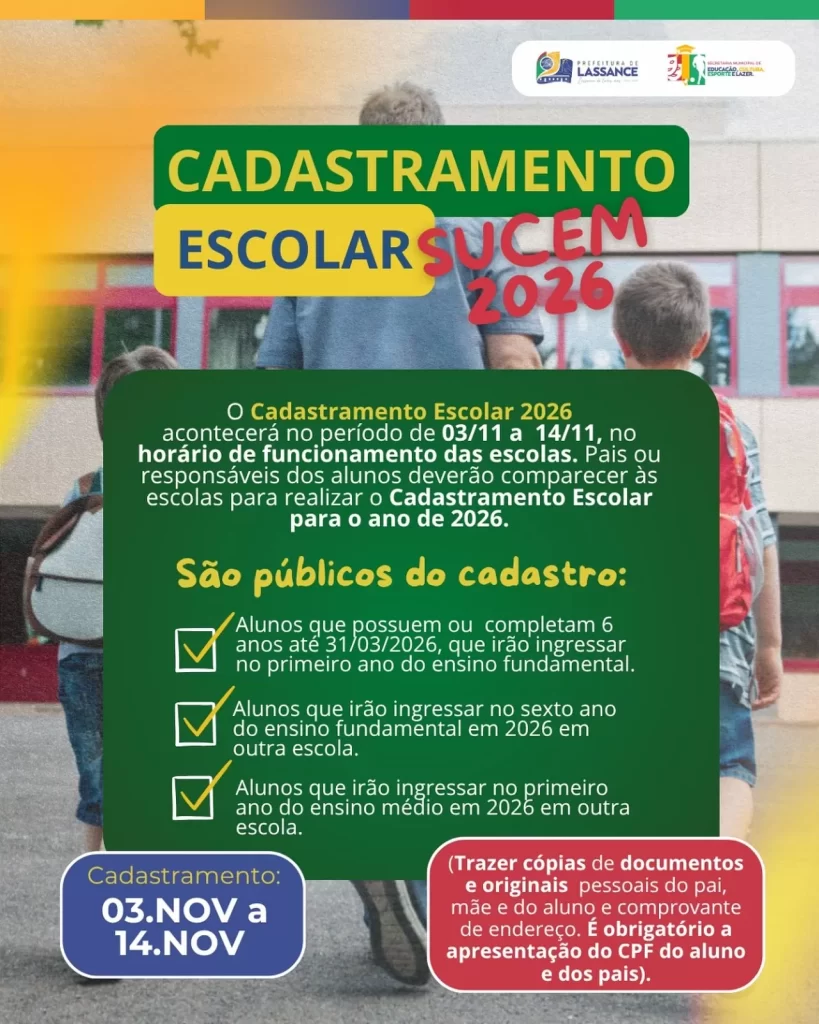 A Prefeitura de Lassance, por meio da Secretaria Municipal de Educação, informa que o Cadastramento Escolar 2026 acontece de 03 a 14 de novembro, no horário de funcionamento das escolas.