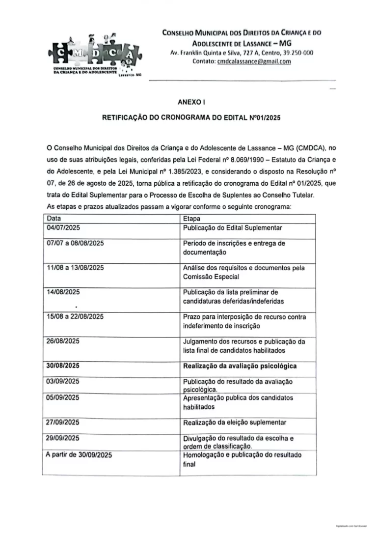 O Conselho Municipal dos Direitos da Criança e do Adolescente de Lassance/MG (CMDCA) publicou [...]