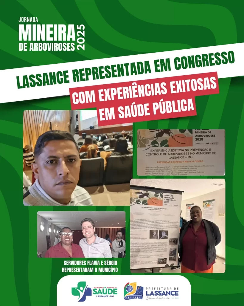 A Prefeitura de Lassance tem orgulho em anunciar a participação dos servidores Flávia Graciano e Sérgio Henrique em um importante Congresso, por meio da Secretaria Municipal de Saúde, sob a liderança da secretária Lorena Rodrigues e do diretor de Vigilância em Saúde Gilson Soares. Ambos apresentaram experiências exitosas que reforçam o compromisso do município com a saúde pública e a qualidade de vida da população.