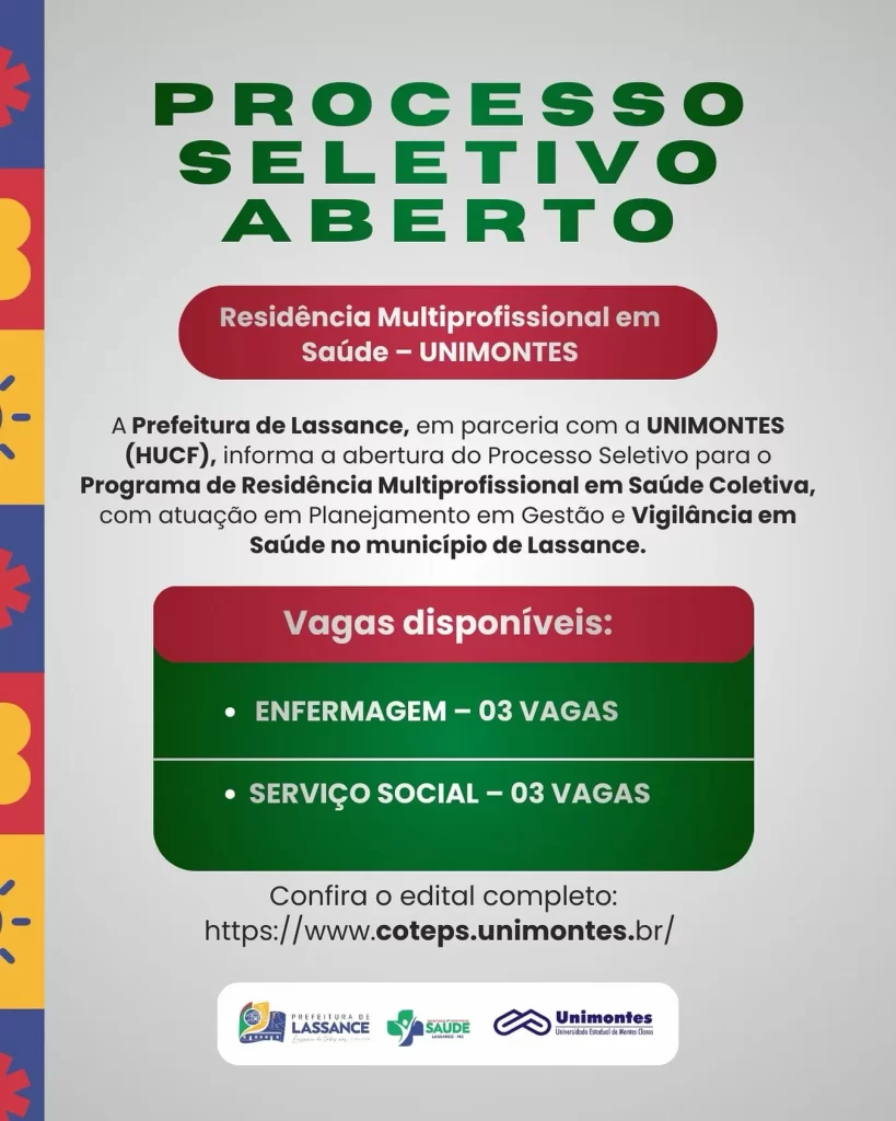 📢 A Universidade Estadual de Montes Claros (Unimontes) abriu inscrições para o Processo Seletivo da Residência Multiprofissional em Saúde Coletiva, com ênfase em Planejamento e Gestão em Saúde e Vigilância em Saúde em Lassance.
